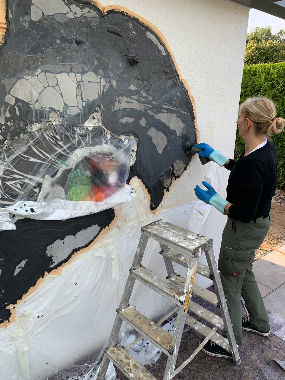 Ein Mosaik, dessen Motiv aus einer Terrassenentfernung von ca. 30m interessant und gut sichtbar ist, möchte ich zugleich im Nahbereich durch interessante Materialien spannend gestalten, denn vor der Wand ist eine weitere Sitzgelegenheit geplant. Der gesamt Garten wird neu gestaltet. Ich kann nur erahnen, wie das Gesamtbild mit meinem Mosaik später aussehen wird! Mein Entwurf ist ein Auge, dessen Iris in Regenbogenfarben jede spätere Farbgestaltung des Gartens aufnimmt, die weitere Arbeit bleibt in dezenten Schwarz- und Grautönen. Richtung Himmel ausgerichtet, fühlt sich der Betrachter nicht "beobachtet". Viele farbintensive italienische Smalten (Mosaikglas) bilden zusammen mit Natursteinen und einer Muschel das Zentrum meines Kunstwerkes. Die Wimpern aus Flachglas gehen über in eine Stirn und Wange aus Fliesen und Natursteinen. Während der linke Teil des Augapfels in Fliese gearbeitet ist, geht der rechte Teil bereits in die Fassadenwand über. So schaffe ich noch mehr Verbindung mit dem Hintergrund. Das Mosaik ist fertig.... jetzt fehlt nur noch der Rest der Gartengestaltung :-)