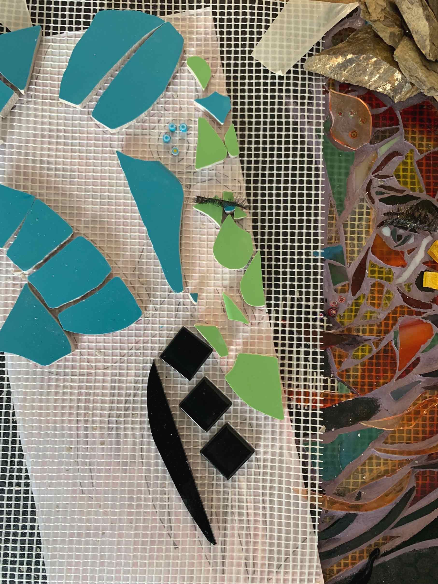 Der Widderkopf liegt über meiner Stirn... ein bedeutender Teil meiner Persönlichkeit. Kreativität (buntes Glas) trifft auf Struktur (grüne und blaue Fliesen). Falsche Wimpern finden als Symbol meiner rheinischen Frohnatur Einzug ins Werk. Eher versöhnlich finden Struktur und Freiheit Platz in meinem Selbstportrait und überschneiden sich sachte... Genauso hin und her gerissen, wie meine Seele ist, verlief die Arbeit hierzu. Von einem Bildnis der Fotographie aus 1999 bin ich ganz weit entfernt. Es diente mir lediglich zur Grundlage für den Anfang eines Kunstwerkes mit Selbsterkenntnis. "It's me"